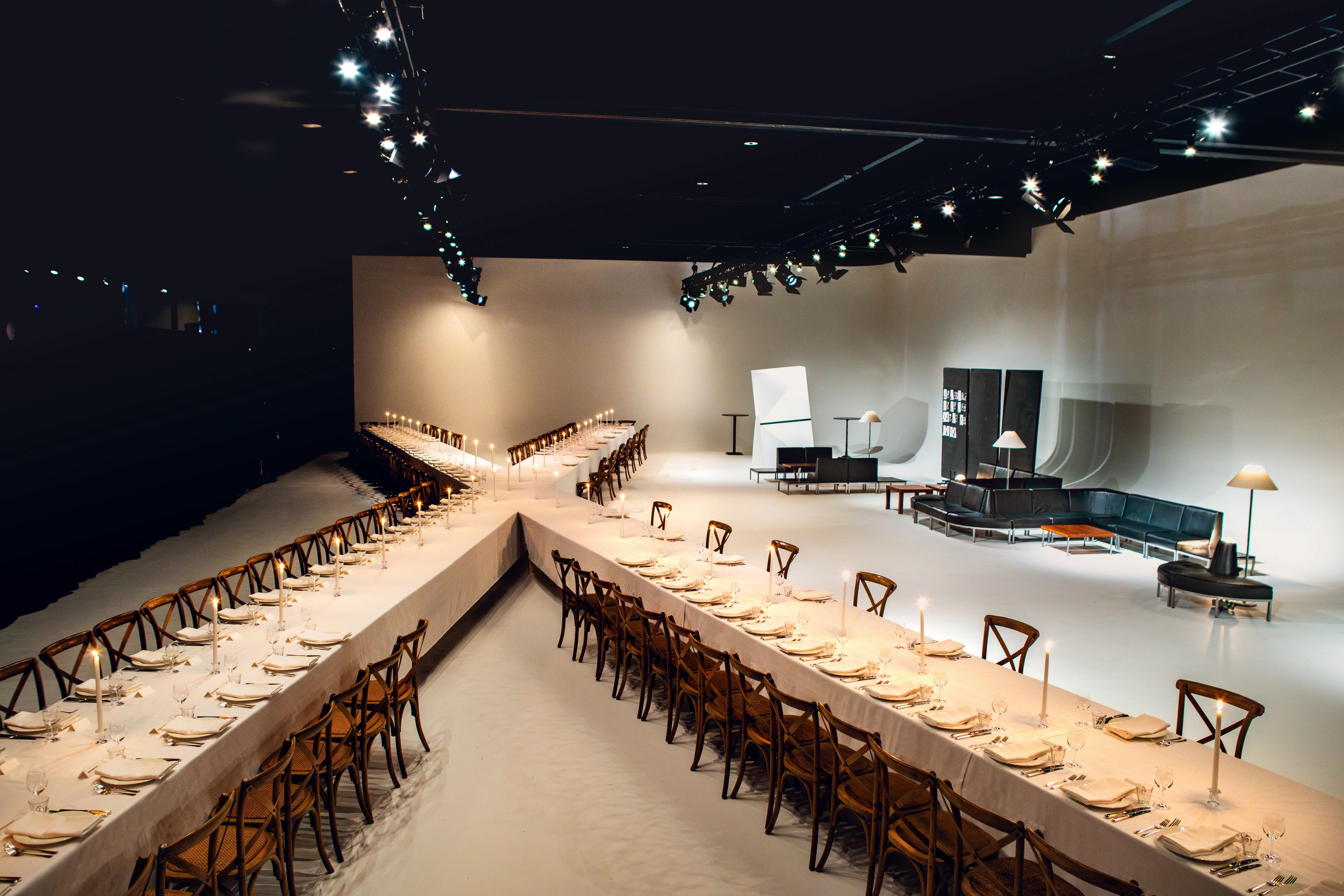 A dramatic table design seated over 100 guests located around a distinctive ‘X’ form. The dining setup enabled guests to watch the shoot progression whilst enjoying a seasonal three-course meal.